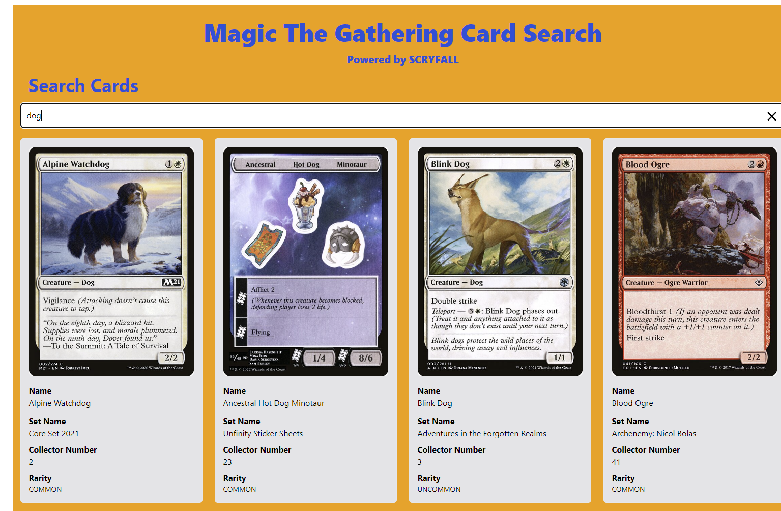 The goal of this project was to create a basic full-stack application using TypeScript, React, Node, Express, and integrating with the Scryfall API for Magic cards. The project includes a backend that serves as a REST endpoint to fetch Magic cards based on a user-provided search string. The frontend, built with React, enables users to search for cards and displays card information such as images, names, set names, numbers, and rarities.