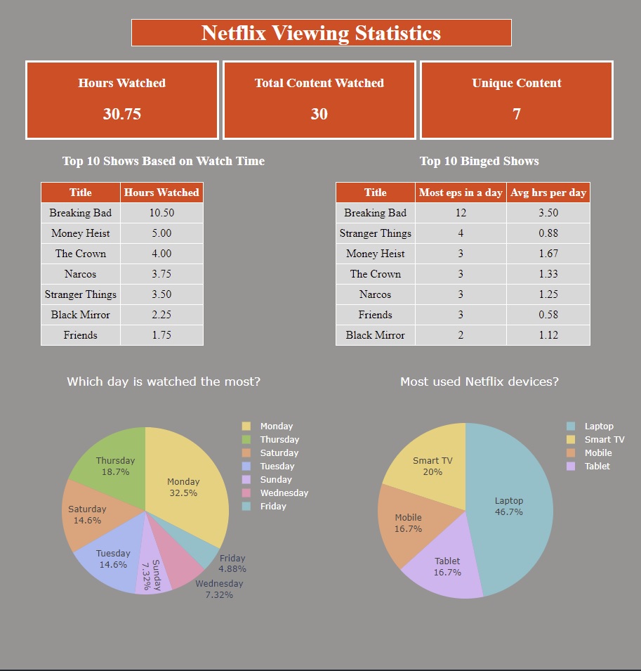 Python data visualization project that analyzes my personal Netflix viewing information. Then deploys it into a dashboard filled with neat statistics about my data using the Dash Python package. Dashboard is styled with HTML/CSS.