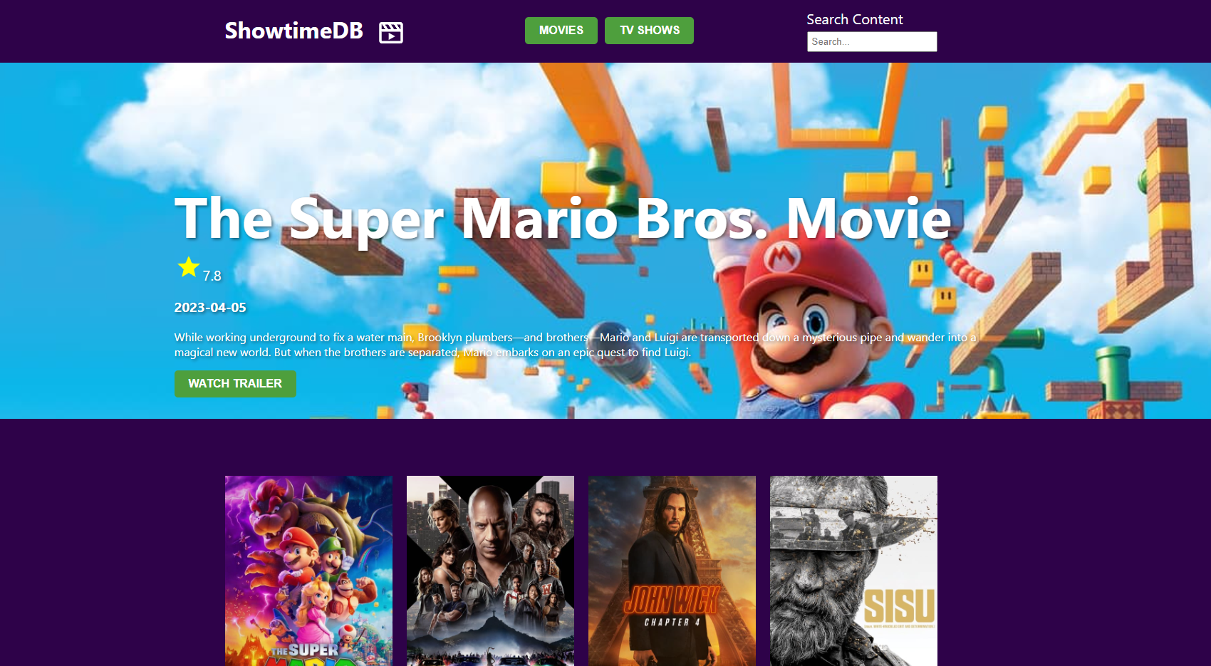 ShowtimeDB is a React-based web app that lets users explore movies and TV shows. Using the TMDb (The Movie Database) API, it offers information on popular movies, top-rated TV shows, and allows searching for specific content. Users can view content details or watch trailers.